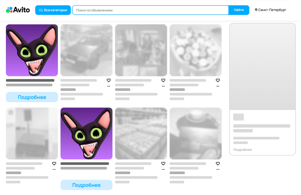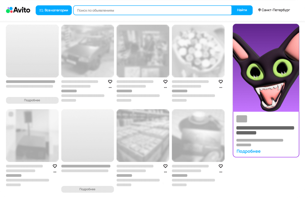 Баннеры мимикрируют под объявления на Авито, но остаются по-прежнему заметным. Картинка, логотип, текст и кнопка являются самостоятельными кликабельными элементами и подталкивают к совершению целевых действий.